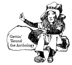 The anthology is organized in a hierarchical three-tiered manner. The highest tier of the hierarchy are the index page (the first page you saw before coming to this page), the five topic pages ( My Back Pages, Across the Great Divide, Tears of Rage, Up Against the Wall... and Yesterday and Today) and the Contributors page. If you select a topic from the topic pages, you will see a page that contains a collection of excerpts about that topic. At the end of each excerpt, you wil see this outlined picture: