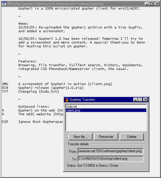(DIR) .. (IMG) client.png 13.7K 2005-10-14 06:06 CEST (DIR) gophdocs 96B 2005-10-12 20:23 CEST (BIN) gopherj1.0.zip 12.7K 2005-10-14 06:06 CEST (BIN) gopherj_log 13.0K 2005-10-14 06:07 CEST (BIN) gopherj_updates 263B 2005-10-12 20:03 CEST (TXT) todo.txt 11.7K 2005-10-14 06:07 CEST