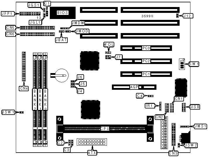 power connector, AGP slot, SB-link connector,