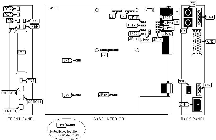 | 34-pin V.35 DTE port | CN3 | Power switch | SW2 |