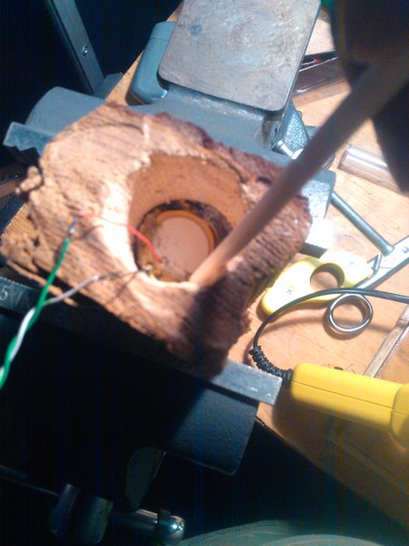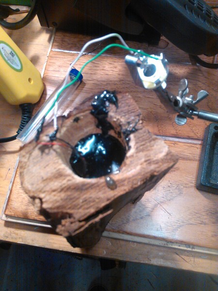 repurposed CAT5, hot glue.) The case is a piece of firewood, which