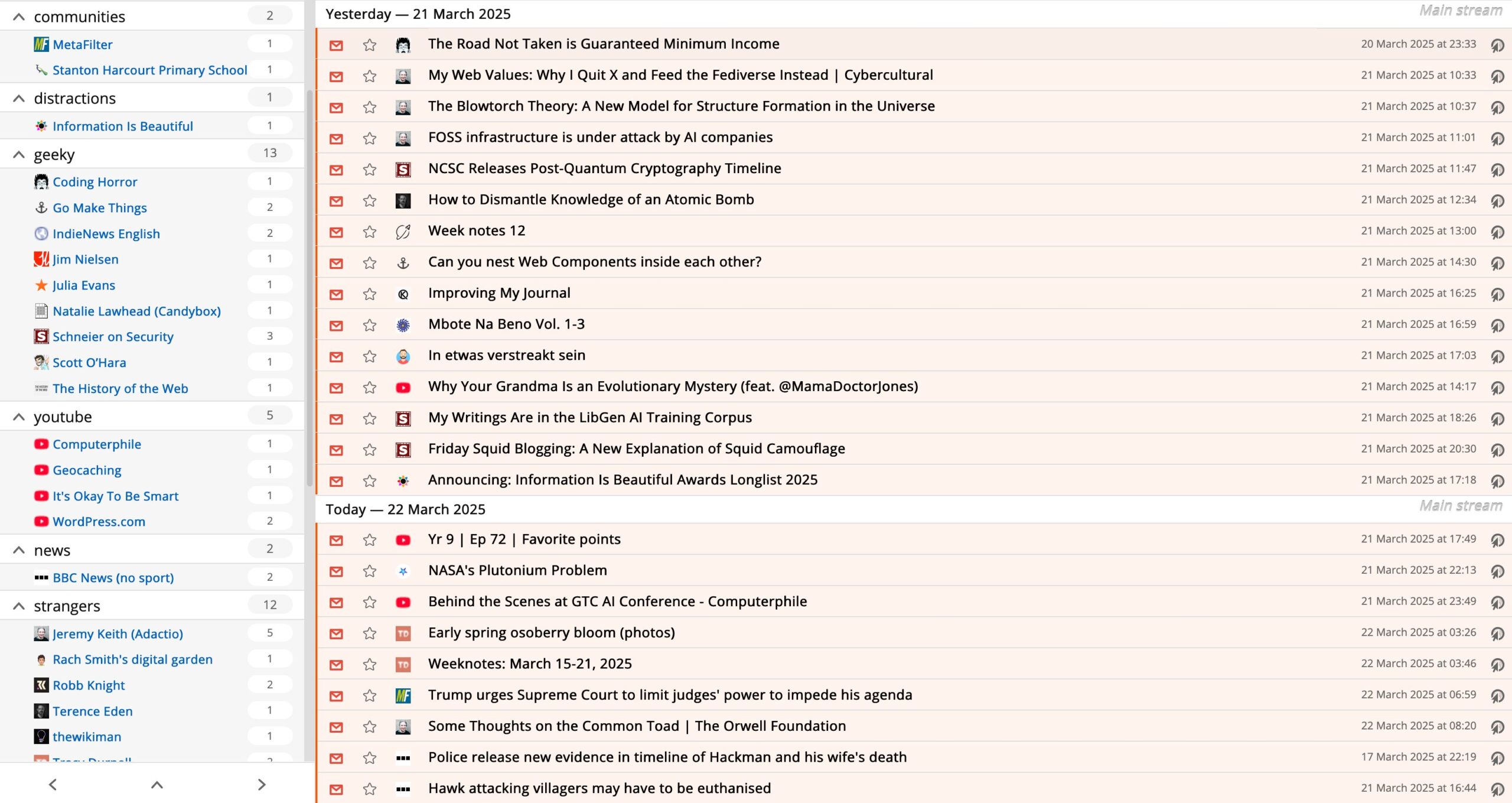 (IMG) FreshRSS screenshot showing a variety of feeds categorised as Communities, Distractions, Geeky, YouTube, News, Strangers, etc. Posts from yesterday and today are visible.