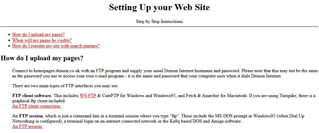 (IMG) 'Setting Up your Web Site, Step by Step Instructions' page, describing use of an FTP client to upload web pages.