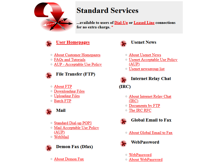 (IMG) Web page listing 'Standard Services' for dial-up and leased line connections, including: user homepages, FTP, email, usenet, IRC, email-to-fax, and fax-to-email services.