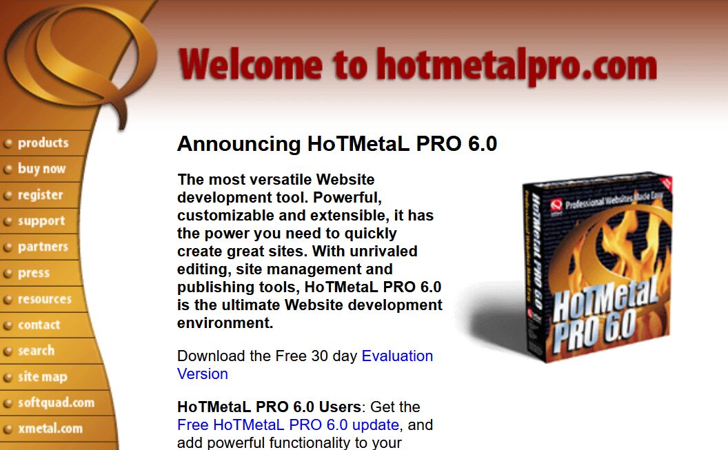 (IMG) Stylish (for circa 2000) webpage for HoTMetaL Pro 6.0, advertising its 'unrivaled [sic] editing, site management and publishing tools'.