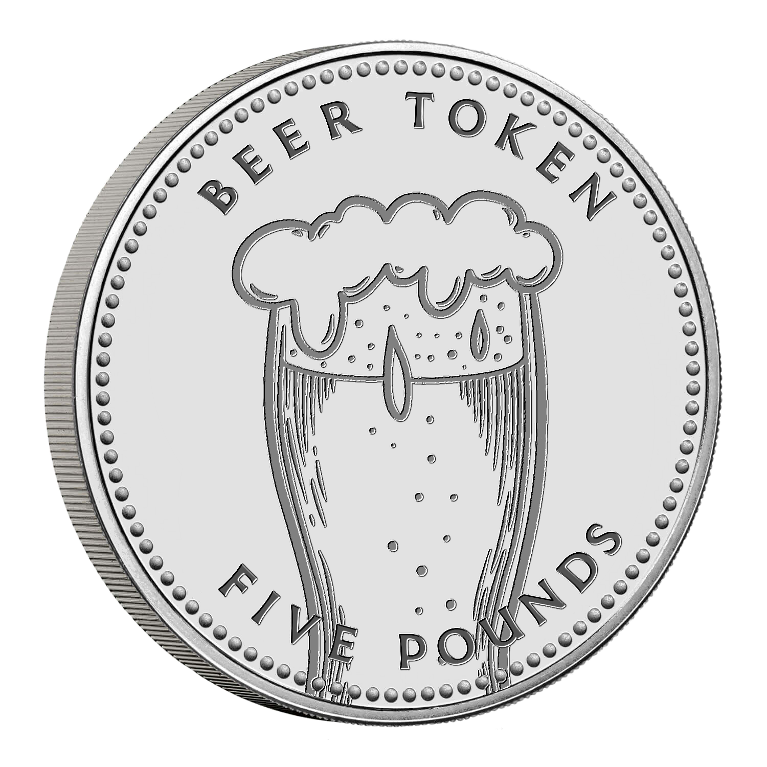 (IMG) Mockup of a silver-coloured £5 coin with the words "FIVE POUNDS" and also "BEER TOKEN" printed around a stylised frothy pint of beer, dripping down the sides of its glass.