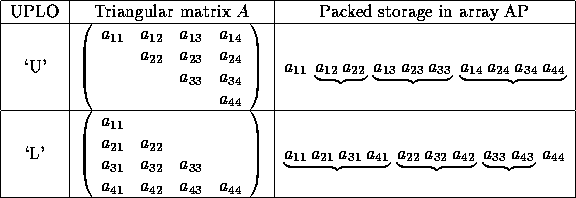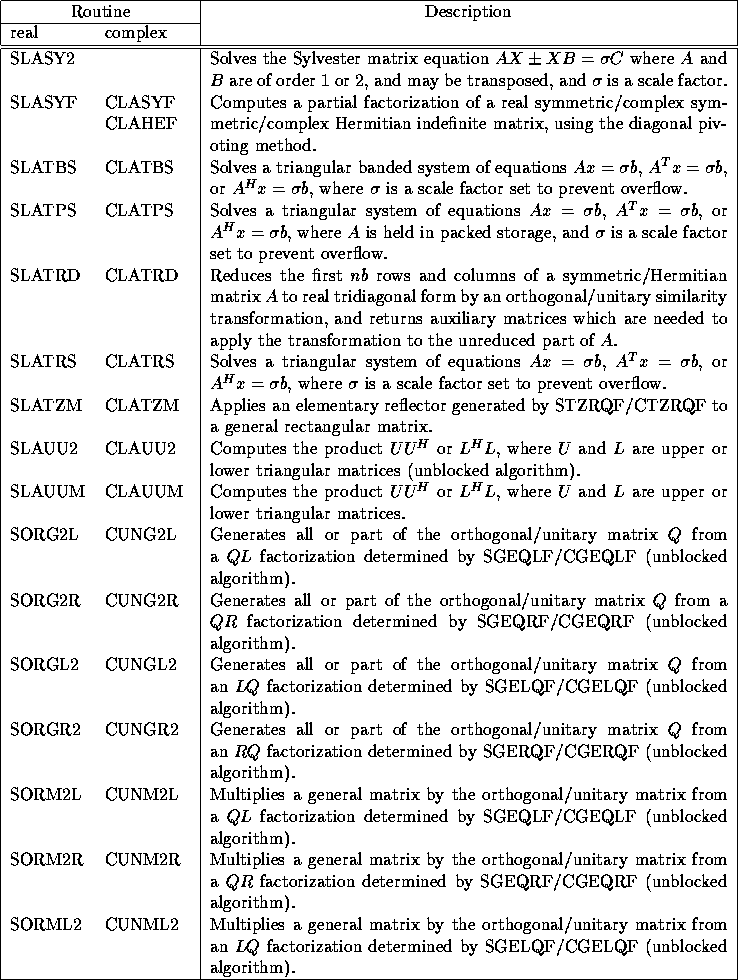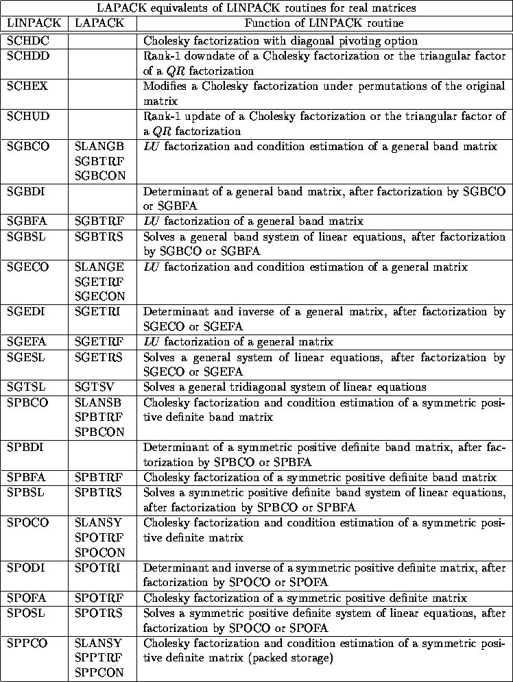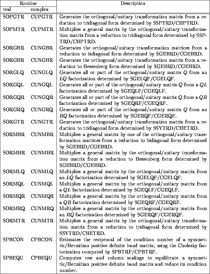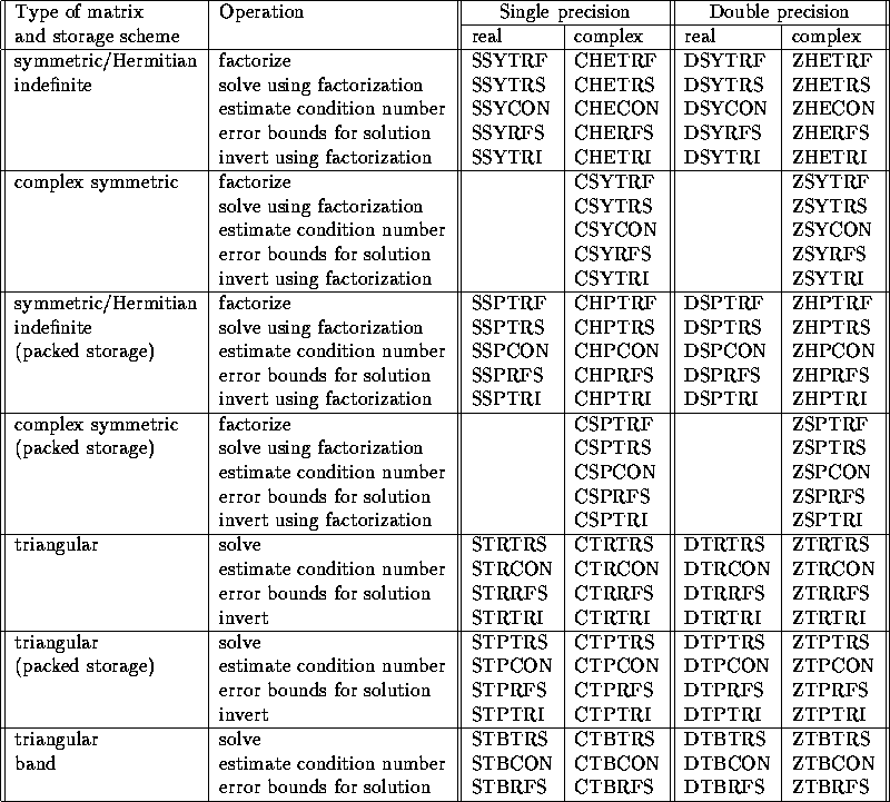 $key = q/{table}[t]labeltabcomplineq2centertabular||l|l||l|l||l|l||hlineTypeofmatrix;html_special_mark_amp;Operation;html_special_mark_amp;multicolumn2c||Singleprecision;html_special_mark_amp;multicolumn2c||Doubleprecisioncline3-6andstoragescheme;html_special_mark_amp;;html_special_mark_amp;real;html_special_mark_amp;complex;html_special_mark_amp;real;html_special_mark_amp;complexhlinesymmetricHermitian;html_special_mark_amp;factorize;html_special_mark_amp;SSYTRFindexSSYTRF;html_special_mark_amp;CHETRFindexCHETRF;html_special_mark_amp;DSYTRFindexDSYTRF;html_special_mark_amp;ZHETRFindexZHETRFindefinite;html_special_mark_amp;solveusingfactorization;html_special_mark_amp;SSYTRSindexSSYTRS;html_special_mark_amp;CHETRSindexCHETRS;html_special_mark_amp;DSYTRSindexDSYTRS;html_special_mark_amp;ZHETRSindexZHETRS;html_special_mark_amp;estimateconditionnumber;html_special_mark_amp;SSYCONindexSSYCON;html_special_mark_amp;CHECONindexCHECON;html_special_mark_amp;DSYCONindexDSYCON;html_special_mark_amp;ZHECONindexZHECON;html_special_mark_amp;errorboundsforsolution;html_special_mark_amp;SSYRFSindexSSYRFS;html_special_mark_amp;CHERFSindexCHERFS;html_special_mark_amp;DSYRFSindexDSYRFS;html_special_mark_amp;ZHERFSindexZHERFS;html_special_mark_amp;invertusingfactorization;html_special_mark_amp;SSYTRIindexSSYTRI;html_special_mark_amp;CHETRIindexCHETRI;html_special_mark_amp;DSYTRIindexDSYTRI;html_special_mark_amp;ZHETRIindexZHETRIhlinecomplexsymmetric;html_special_mark_amp;factorize;html_special_mark_amp;;html_special_mark_amp;CSYTRFindexCSYTRF;html_special_mark_amp;;html_special_mark_amp;ZSYTRFindexZSYTRF;html_special_mark_amp;solveusingfactorization;html_special_mark_amp;;html_special_mark_amp;CSYTRSindexCSYTRS;html_special_mark_amp;;html_special_mark_amp;ZSYTRSindexZSYTRS;html_special_mark_amp;estimateconditionnumber;html_special_mark_amp;;html_special_mark_amp;CSYCONindexCSYCON;html_special_mark_amp;;html_special_mark_amp;ZSYCONindexZSYCON;html_special_mark_amp;errorboundsforsolution;html_special_mark_amp;;html_special_mark_amp;CSYRFSindexCSYRFS;html_special_mark_amp;;html_special_mark_amp;ZSYRFSindexZSYRFS;html_special_mark_amp;invertusingfactorization;html_special_mark_amp;;html_special_mark_amp;CSYTRIindexCSYTRI;html_special_mark_amp;;html_special_mark_amp;ZSYTRIindexZSYTRIhlinesymmetricHermitian;html_special_mark_amp;factorize;html_special_mark_amp;SSPTRFindexSSPTRF;html_special_mark_amp;CHPTRFindexCHPTRF;html_special_mark_amp;DSPTRFindexDSPTRF;html_special_mark_amp;ZHPTRFindexZHPTRFindefinite;html_special_mark_amp;solveusingfactorization;html_special_mark_amp;SSPTRSindexSSPTRS;html_special_mark_amp;CHPTRSindexCHPTRS;html_special_mark_amp;DSPTRSindexDSPTRS;html_special_mark_amp;ZHPTRSindexZHPTRS(packedstorage);html_special_mark_amp;estimateconditionnumber;html_special_mark_amp;SSPCONindexSSPCON;html_special_mark_amp;CHPCONindexCHPCON;html_special_mark_amp;DSPCONindexDSPCON;html_special_mark_amp;ZHPCONindexZHPCON;html_special_mark_amp;errorboundsforsolution;html_special_mark_amp;SSPRFSindexSSPRFS;html_special_mark_amp;CHPRFSindexCHPRFS;html_special_mark_amp;DSPRFSindexDSPRFS;html_special_mark_amp;ZHPRFSindexZHPRFS;html_special_mark_amp;invertusingfactorization;html_special_mark_amp;SSPTRIindexSSPTRI;html_special_mark_amp;CHPTRIindexCHPTRI;html_special_mark_amp;DSPTRIindexDSPTRI;html_special_mark_amp;ZHPTRIindexZHPTRIhlinecomplexsymmetric;html_special_mark_amp;factorize;html_special_mark_amp;;html_special_mark_amp;CSPTRFindexCSPTRF;html_special_mark_amp;;html_special_mark_amp;ZSPTRFindexZSPTRF(packedstorage);html_special_mark_amp;solveusingfactorization;html_special_mark_amp;;html_special_mark_amp;CSPTRSindexCSPTRS;html_special_mark_amp;;html_special_mark_amp;ZSPTRSindexZSPTRS;html_special_mark_amp;estimateconditionnumber;html_special_mark_amp;;html_special_mark_amp;CSPCONindexCSPCON;html_special_mark_amp;;html_special_mark_amp;ZSPCONindexZSPCON;html_special_mark_amp;errorboundsforsolution;html_special_mark_amp;;html_special_mark_amp;CSPRFSindexCSPRFS;html_special_mark_amp;;html_special_mark_amp;ZSPRFSindexZSPRFS;html_special_mark_amp;invertusingfactorization;html_special_mark_amp;;html_special_mark_amp;CSPTRIindexCSPTRI;html_special_mark_amp;;html_special_mark_amp;ZSPTRIindexZSPTRIhlinetriangular;html_special_mark_amp;solve;html_special_mark_amp;STRTRSindexSTRTRS;html_special_mark_amp;CTRTRSindexCTRTRS;html_special_mark_amp;DTRTRSindexDTRTRS;html_special_mark_amp;ZTRTRSindexZTRTRS;html_special_mark_amp;estimateconditionnumber;html_special_mark_amp;STRCONindexSTRCON;html_special_mark_amp;CTRCONindexCTRCON;html_special_mark_amp;DTRCONindexDTRCON;html_special_mark_amp;ZTRCONindexZTRCON;html_special_mark_amp;errorboundsforsolution;html_special_mark_amp;STRRFSindexSTRRFS;html_special_mark_amp;CTRRFSindexCTRRFS;html_special_mark_amp;DTRRFSindexDTRRFS;html_special_mark_amp;ZTRRFSindexZTRRFS;html_special_mark_amp;invert;html_special_mark_amp;STRTRIindexSTRTRI;html_special_mark_amp;CTRTRIindexCTRTRI;html_special_mark_amp;DTRTRIindexDTRTRI;html_special_mark_amp;ZTRTRIindexZTRTRIhlinetriangular;html_special_mark_amp;solve;html_special_mark_amp;STPTRSindexSTPTRS;html_special_mark_amp;CTPTRSindexCTPTRS;html_special_mark_amp;DTPTRSindexDTPTRS;html_special_mark_amp;ZTPTRSindexZTPTRS(packedstorage);html_special_mark_amp;estimateconditionnumber;html_special_mark_amp;STPCONindexSTPCON;html_special_mark_amp;CTPCONindexCTPCON;html_special_mark_amp;DTPCONindexDTPCON;html_special_mark_amp;ZTPCONindexZTPCON;html_special_mark_amp;errorboundsforsolution;html_special_mark_amp;STPRFSindexSTPRFS;html_special_mark_amp;CTPRFSindexCTPRFS;html_special_mark_amp;DTPRFSindexDTPRFS;html_special_mark_amp;ZTPRFSindexZTPRFS;html_special_mark_amp;invert;html_special_mark_amp;STPTRIindexSTPTRI;html_special_mark_amp;CTPTRIindexCTPTRI;html_special_mark_amp;DTPTRIindexDTPTRI;html_special_mark_amp;ZTPTRIindexZTPTRIhlinetriangular;html_special_mark_amp;solve;html_special_mark_amp;STBTRSindexSTBTRS;html_special_mark_amp;CTBTRSindexCTBTRS;html_speci