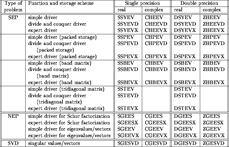 $key = q/{table}[ht]labeltabdriveseigcentertabular||c|l||l|l||l|l||hlineTypeof;html_special_mark_amp;Functionandstoragescheme;html_special_mark_amp;multicolumn2c||Singleprecision;html_special_mark_amp;multicolumn2c||Doubleprecisioncline3-6problem;html_special_mark_amp;;html_special_mark_amp;real;html_special_mark_amp;complex;html_special_mark_amp;real;html_special_mark_amp;complexhlinehlineSEP;html_special_mark_amp;simpledriver;html_special_mark_amp;SSYEVindexSSYEV;html_special_mark_amp;CHEEVindexCHEEV;html_special_mark_amp;DSYEVindexDSYEV;html_special_mark_amp;ZHEEVindexZHEEV;html_special_mark_amp;divideandconquerdriver;html_special_mark_amp;SSYEVDindexSSYEVD;html_special_mark_amp;CHEEVDindexCHEEVD;html_special_mark_amp;DSYEVDindexDSYEVD;html_special_mark_amp;ZHEEVDindexZHEEVD;html_special_mark_amp;expertdriver;html_special_mark_amp;SSYEVXindexSSYEVX;html_special_mark_amp;CHEEVXindexCHEEVX;html_special_mark_amp;DSYEVXindexDSYEVX;html_special_mark_amp;ZHEEVXindexZHEEVXhline;html_special_mark_amp;simpledriver(packedstorage);html_special_mark_amp;SSPEVindexSSPEV;html_special_mark_amp;CHPEVindexCHPEV;html_special_mark_amp;DSPEVindexDSPEV;html_special_mark_amp;ZHPEVindexZHPEV;html_special_mark_amp;divideandconquerdriver;html_special_mark_amp;SSPEVDindexSSPEVD;html_special_mark_amp;CHPEVDindexCHPEVD;html_special_mark_amp;DSPEVDindexDSPEVD;html_special_mark_amp;ZHPEVDindexZHPEVD;html_special_mark_amp;hspace*.2in(packedstorage);html_special_mark_amp;;html_special_mark_amp;;html_special_mark_amp;;html_special_mark_amp;;html_special_mark_amp;expertdriver(packedstorage);html_special_mark_amp;SSPEVXindexSSPEVX;html_special_mark_amp;CHPEVXindexCHPEVX;html_special_mark_amp;DSPEVXindexDSPEVX;html_special_mark_amp;ZHPEVXindexZHPEVXhline;html_special_mark_amp;simpledriver(bandmatrix);html_special_mark_amp;SSBEVindexSSBEV;html_special_mark_amp;CHBEVindexCHBEV;html_special_mark_amp;DSBEVindexDSBEV;html_special_mark_amp;ZHBEVindexZHBEV;html_special_mark_amp;divideandconquerdriver;html_special_mark_amp;SSBEVDindexSSBEVD;html_special_mark_amp;CHBEVDindexCHBEVD;html_special_mark_amp;DSBEVDindexDSBEVD;html_special_mark_amp;ZHBEVDindexZHBEVD;html_special_mark_amp;hspace*.2in(bandmatrix);html_special_mark_amp;;html_special_mark_amp;;html_special_mark_amp;;html_special_mark_amp;;html_special_mark_amp;expertdriver(bandmatrix);html_special_mark_amp;SSBEVXindexSSBEVX;html_special_mark_amp;CHBEVXindexCHBEVX;html_special_mark_amp;DSBEVXindexDSBEVX;html_special_mark_amp;ZHBEVXindexZHBEVXhline;html_special_mark_amp;simpledriver(tridiagonalmatrix);html_special_mark_amp;SSTEVindexSSTEV;html_special_mark_amp;;html_special_mark_amp;DSTEVindexDSTEV;html_special_mark_amp;;html_special_mark_amp;divideandconquerdriver;html_special_mark_amp;SSTEVDindexSSTEVD;html_special_mark_amp;;html_special_mark_amp;DSTEVDindexDSTEVD;html_special_mark_amp;;html_special_mark_amp;hspace*.2in(tridiagonalmatrix);html_special_mark_amp;;html_special_mark_amp;;html_special_mark_amp;;html_special_mark_amp;;html_special_mark_amp;expertdriver(tridiagonalmatrix);html_special_mark_amp;SSTEVXindexSSTEVX;html_special_mark_amp;;html_special_mark_amp;DSTEVXindexDSTEVX;html_special_mark_amp;hlinehlineNEP;html_special_mark_amp;simpledriverforSchurfactorization;html_special_mark_amp;SGEESindexSGEES;html_special_mark_amp;CGEESindexCGEES;html_special_mark_amp;DGEESindexDGEES;html_special_mark_amp;ZGEESindexZGEES;html_special_mark_amp;expertdriverforSchurfactorization;html_special_mark_amp;SGEESXindexSGEESX;html_special_mark_amp;CGEESXindexCGEESX;html_special_mark_amp;DGEESXindexDGEESX;html_special_mark_amp;ZGEESXindexZGEESX;html_special_mark_amp;simpledriverforeigenvaluesvectors;html_special_mark_amp;SGEEVindexSGEEV;html_special_mark_amp;CGEEVindexCGEEV;html_special_mark_amp;DGEEVindexDGEEV;html_special_mark_amp;ZGEEVindexZGEEV;html_special_mark_amp;expertdriverforeigenvaluesvectors;html_special_mark_amp;SGEEVXindexSGEEVX;html_special_mark_amp;CGEEVXindexCGEEVX;html_special_mark_amp;DGEEVXindexDGEEVX;html_special_mark_amp;ZGEEVXindexZGEEVXhlinehlineSVD;html_special_mark_amp;singularvaluesvectors;html_special_mark_amp;SGESVDindexSGESVD;html_special_mark_amp;CGESVDindexCGESVD;html_special_mark_amp;DGESVDindexDGESVD;html_special_mark_amp;ZGESVDindexZGESVDhlinetabularcenter{table}/;