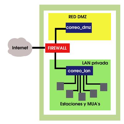 Supondremos que nuestra organización se desempeña tras un Firewall. Podríamos hacer que el esquema anterior siga sin variaciones simplemente habilitando los puertos respectivos en el filtro de paquetes. Sin embargo, aquí consideraremos una situación más complicada en la que se requiere de dos servidores de email. Asumimos que el lector conoce el concepto de una red DMZ (zona desmilitarizada) usada como primera línea de defensa para los servicios que deben dar cara al exterior.
