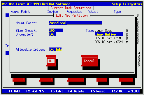 To Add a new partition, select the Add button, and press [Space] or [Enter]. A dialog box entitled ``Edit New Partition'' will appear (see Figure 17). It contains the following fields: