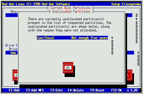 If you attempt to add a partition and Disk Druid can't carry out your request, you'll see a dialog box like the one in Figure 18. In the box are listed any partitions that are currently unallocated, along with the reason they could not be allocated. Select the Ok button, and press [Space] to continue. Note that the unallocated partition(s) are also displayed on Disk Druid's main screen (though you may have to scroll the ``Current Disk Partitions'' section to see them).