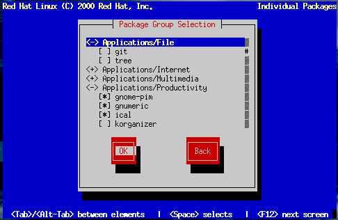 To see the list of packages in the Applications/Editors category, for example, use the arrow keys to select this group and press Enter or Space. When you do, the + sign (closed) changes to a - sign (open) and a list of packages in this category appears. An * appears beside currently selected packages. Press the Enter or Space keys to select or deselect packages.
