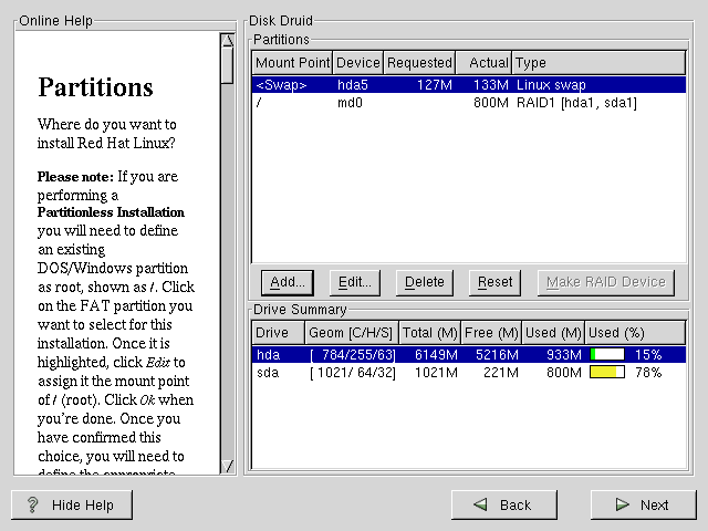 RAID is available in both the GUI and kickstart installation modes. You can use fdisk or Disk Druid to create your RAID configuration, but these instructions will focus mainly on using Disk Druid to complete this task.