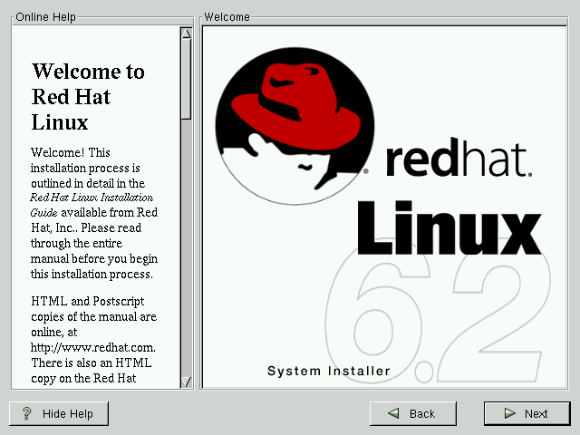 The "Welcome" screen (see Figure 3-4) does not prompt you for any installation input. Please read over the help text in the left panel for additional instructions and information on where to register your Official Red Hat Linux product.
