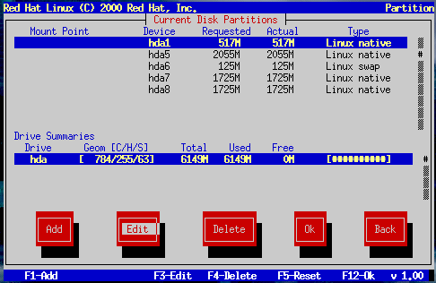 Use the F5 (Reset) function key to discard all changes you may have made while in Disk Druid, and return the list of partitions to those read from the partition table(s) on your hard disk(s). When selected, you'll be asked to confirm whether you want to discard the changes. Note that any mount points you've specified will be lost, and will need to be reentered.