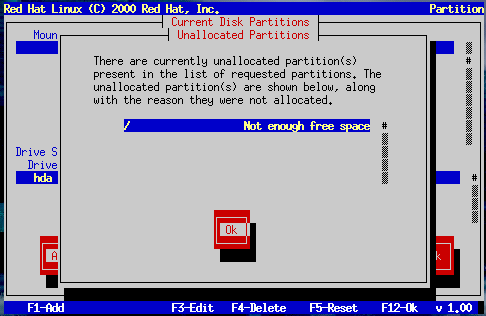 If you attempt to add a partition and Disk Druid can't carry out your request, you'll see a dialog box listing any partitions that are currently unallocated, along with the reason they could not be allocated, as in Figure 10-17. Select the OK button, and press Space to continue. Note that the unallocated partition(s) are also displayed on Disk Druid's main screen (though you may have to scroll the Current Disk Partitions section to see them).