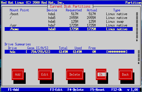 The Drive Summaries section is displayed only to indicate your computer's disk configuration. It is not meant to be used as a means of specifying the target hard drive for a given partition. This is described more completely in the section called Adding a Partition.