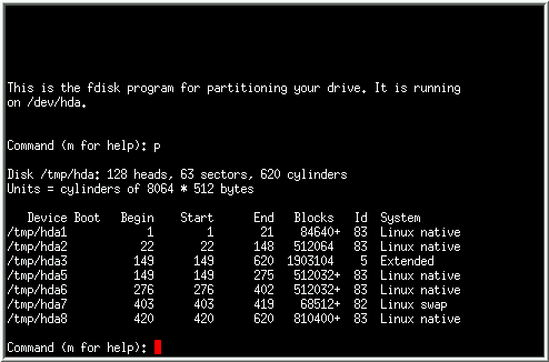 • Linux fdisk creates partitions of type Linux native by default. When you create a swap partition, don't forget to change it to type Linux swap using the t command. The value for the Linux swap type is 82. For other partition types, use the l command to see a list of partition types and values.