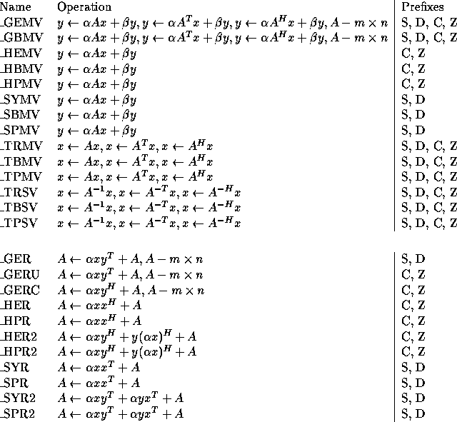 For the Level 2 BLAS a set of extended-precision routines with the prefixes ES, ED, EC, EZ may also be available.