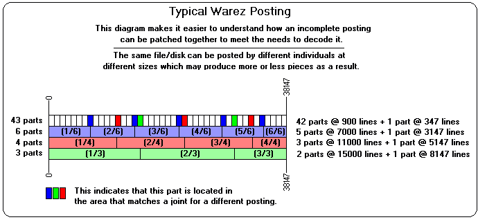 Example One: Using chartThe missing lines you require would be located in two large parts that covers about 75% of the repost. Kind of useless unless of coarse the last piece didn't get through and you have that portion of it. Besides this is hardly worth the effort if all you're after is a single disk sized posting. But if the file is a single 9 meg ZIP you sure don't want to download the whole thing again.