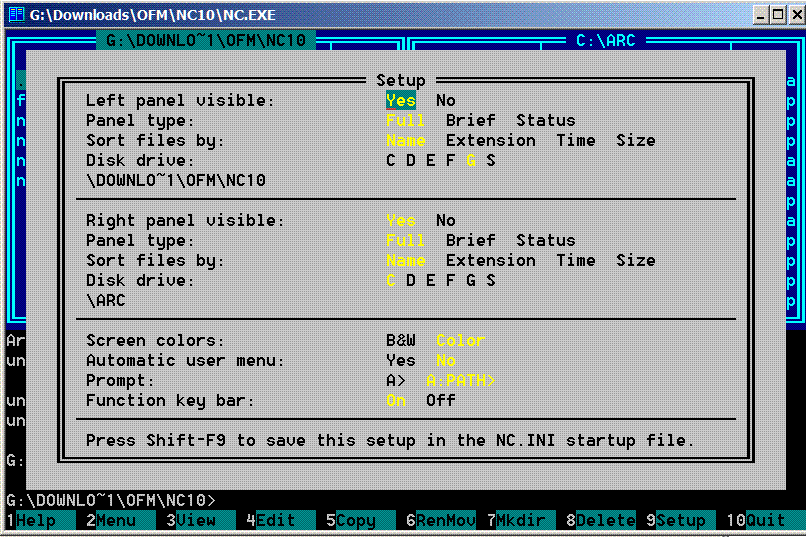 Norton Commander for DOS is the original line of Orthodox file managers that exists in five major versions: 1.0, 2.0, 3.0, 4.0 and 5.0. Only the last one has an additional sub-version (nc 5.5). All versions are still used (mostly by DOS enthusiasts) and are often posted on the abandonware sites. What is interesting, despite clear superiority of later versions, there are still users of version 1.0 of NC. For example, Symantec site contains an FAQ article: Is Norton Commander Version 1.0 or 2.0 Supported Under Windows NT 5 (Beta)?. Also in October of 2005 I received the following email addressed to me as an editor of the OFM page at the Softpanorama website ( Orthodox File Managers: Home of the OFM standards):