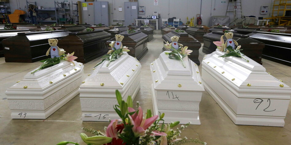 (IMG) Bild: Ihnen helfen keine großen Worte mehr – Särge mit den Opfern von Lampedusa.