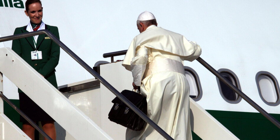 Gebetsbrevier) trägt er selbst ins Flugzeug. Und auf dem Rückflug der