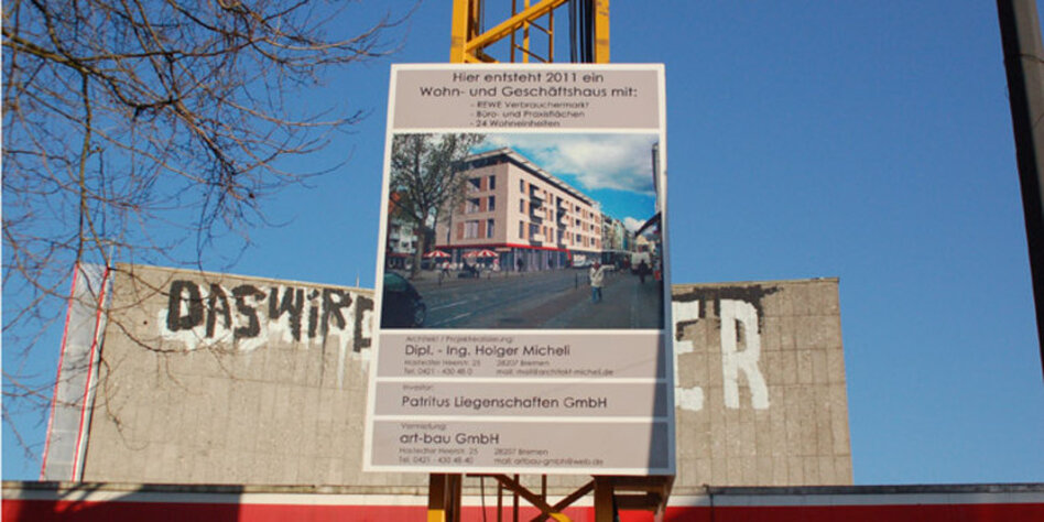 in der obersten Etage mit Geschäftsräumen. Auf dem Baustellenzaun kündigen