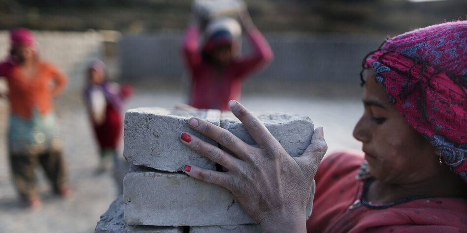 (IMG) Bild: Ziegel für den Wiederaufbau: Arbeiterin in einer Ziegelbrennerei in Lalitpur bei Kathmandu.