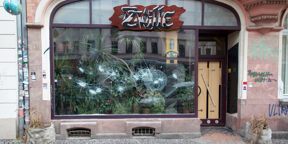 > Im Leipziger Alternativkiez ist nach dem Überfall vieles zerstört. Die