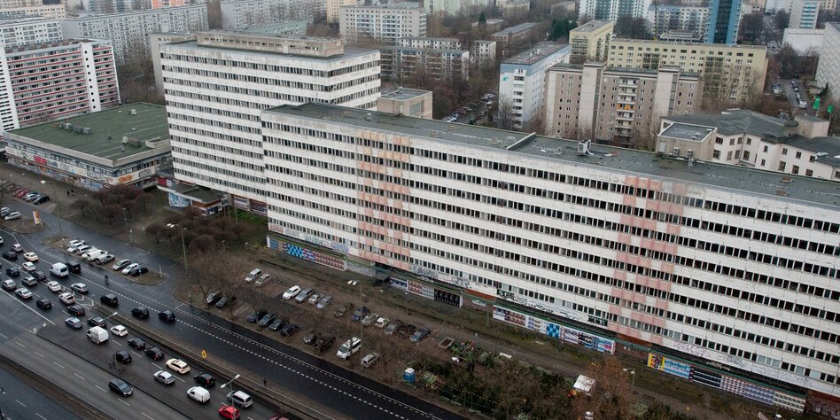(IMG) Bild: Kann aus diesem maroden Klotz ein Zentrum für Geflüchtete werden? Haus der Statistik am Alex.