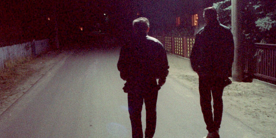 Ein Foto von zwei Männern, von hinten aufgenommen, auf deren dunklen Jacken
