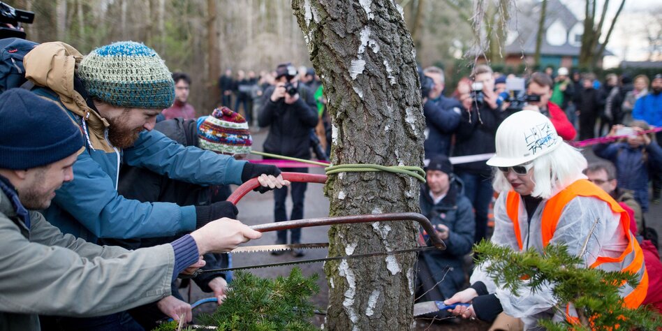 symbolischen Kettensägen-Massaker die Bäume ab.