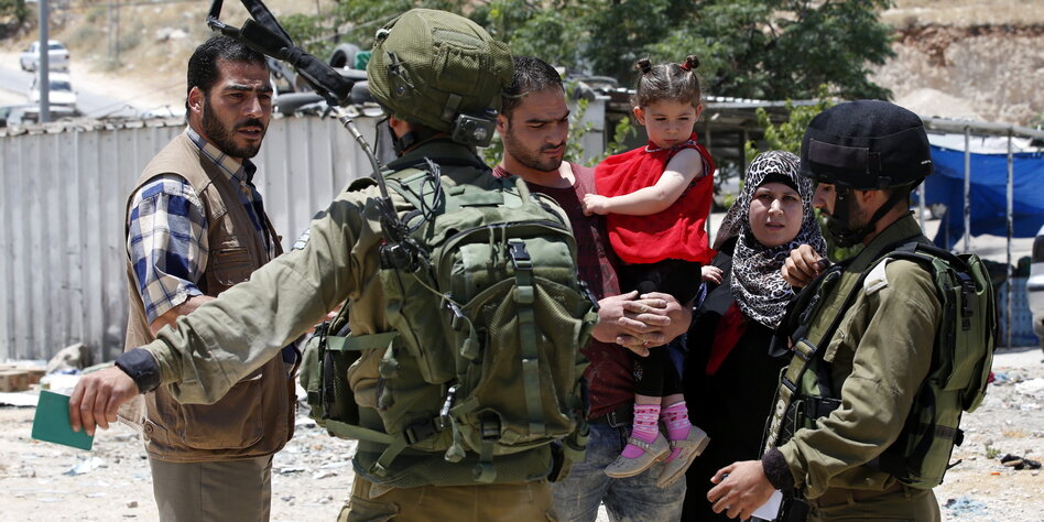 (IMG) Bild: Israelische Soldaten stehen an einem Checkpoint beim Dorf Jata im südlichen Westjordanland Wache