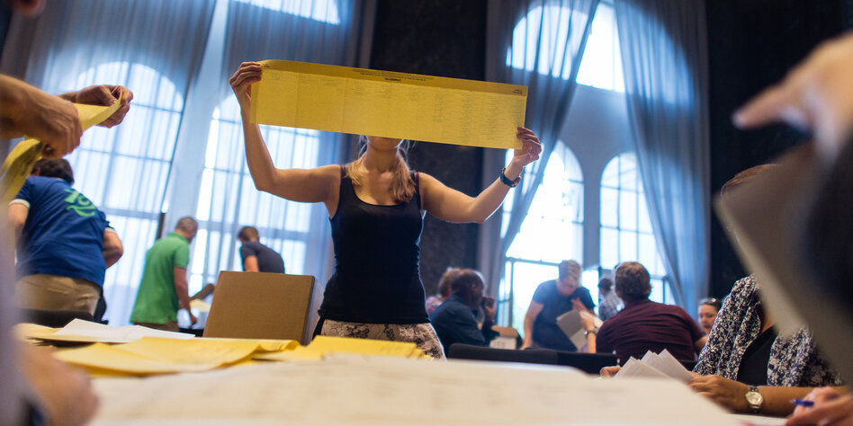 (IMG) Bild: Auszählung der Briefwahl-Stimmen im neuen Rathaus in Hannover am Sonntag