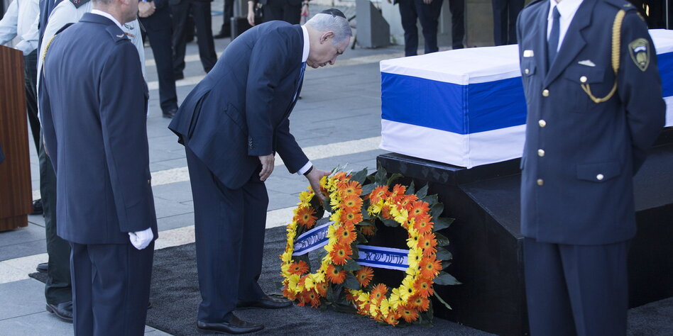 (IMG) Bild: Benjamin Netanjahu legt einen Kranz vor dem Sarg von Schimon Peres nieder
