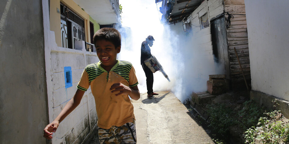 (IMG) Bild: Kampf gegen Denguefieber: Ein Arbeiter räuchert in Colombo, Sri Lanka, ein Moskito-Nest aus