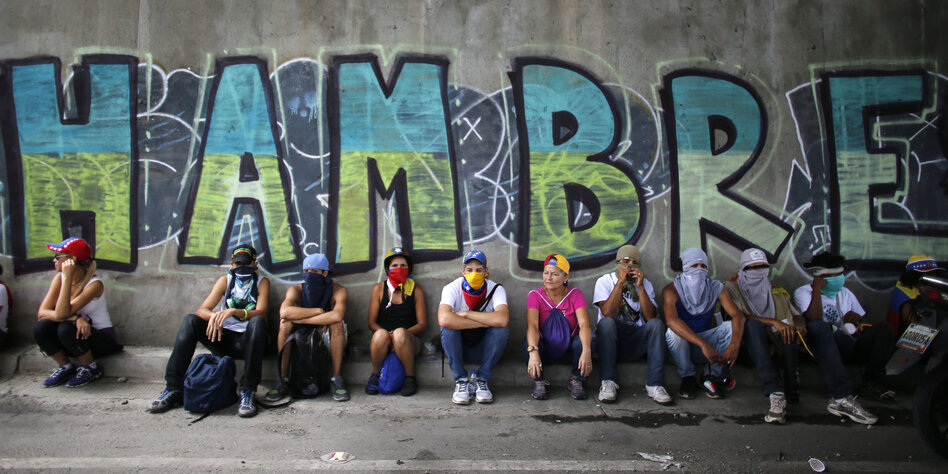 (IMG) Bild: „Hunger“: Die Wirtschaftskrise hat zu Versorgungsengpässen geführt – DemonstrantInnen am Samstag in Caracas