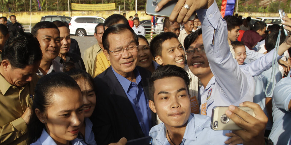 (IMG) Bild: Junge Leute machen Selfies mit Kambodschas starkem Mann Hun Sen