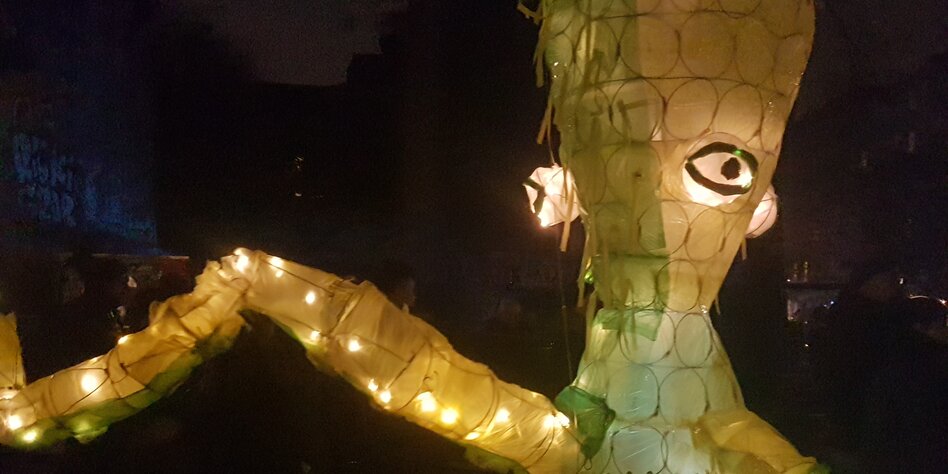 > In Kreuzberg läuft eine Krake durch die Straßen. Als Laterne. Und mit