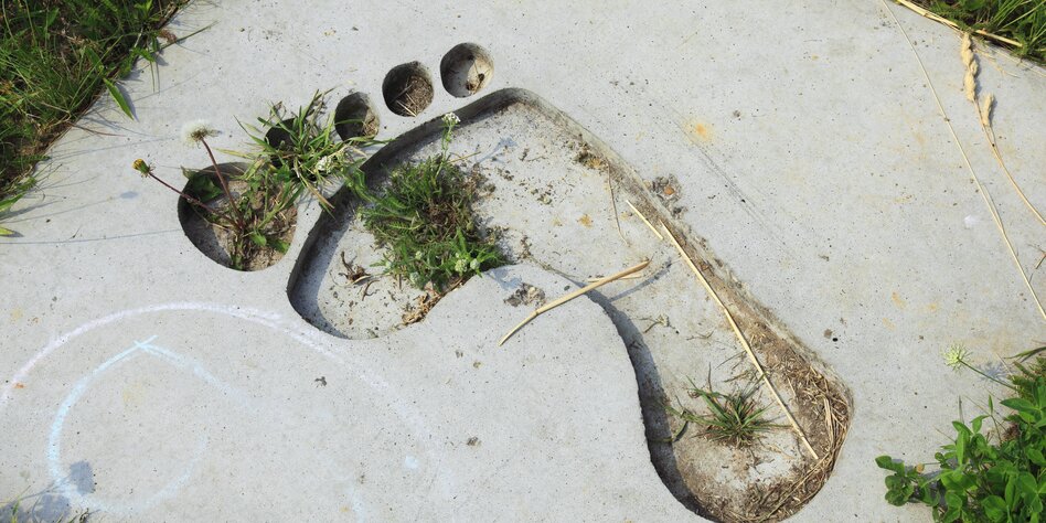 (IMG) Bild: Statt CO2 Fußabdruck steinerner Fußabdruck am Spazierweg auf den Tippelsberg