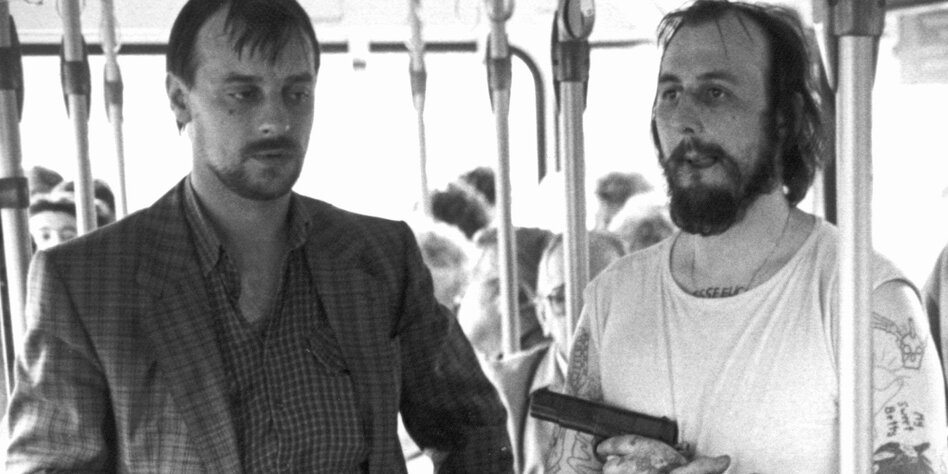 (IMG) Bild: Vor 30 Jahren: Geiselnehmer Degowski und Rösner stehen in dem von ihnen gekaperten Linienbus.