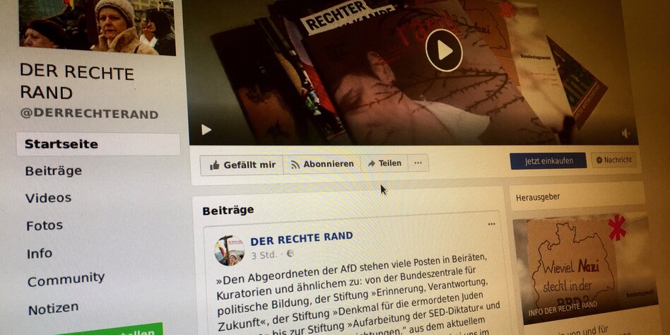 (IMG) Bild: Der Facebook-Auftritt von „Der Rechte Rand“. Auch hier berichtet das Magazin kritisch über die AfD