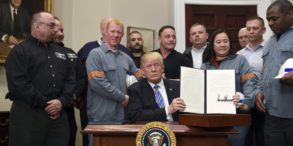 (IMG) Bild: US-Präsident Trump, als er am vergangenen Freitag in Washington im Beisein von Stahlarbeitern Strafzölle ankündigt