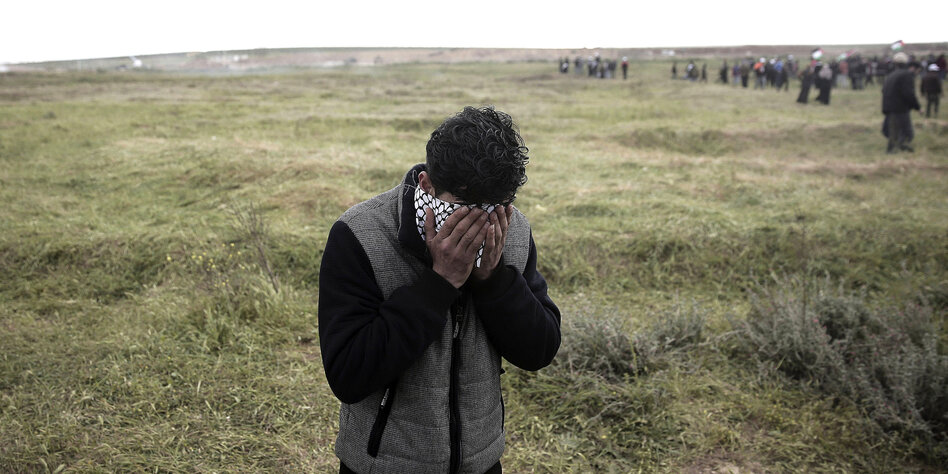 (IMG) Bild: Ein Mann, der Tränengas abbekommen hat – doch auch die innerpalästinensische Malaise ist zum Heulen