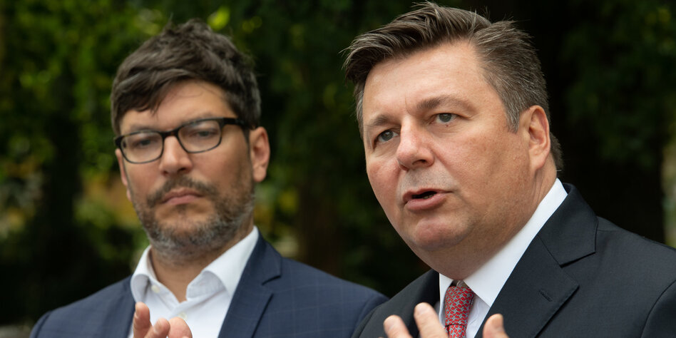 (IMG) Bild: Am Alex: Justizsenator Dirk Behrendt (Grüne) und Innensenator Andreas Geisel (SPD) (v.l.)