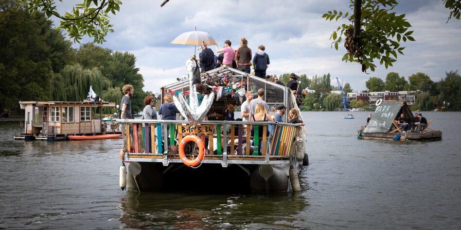 > Mit einer Floß-Demo vorm Spreepark kritisiert ein buntes Bündnis das