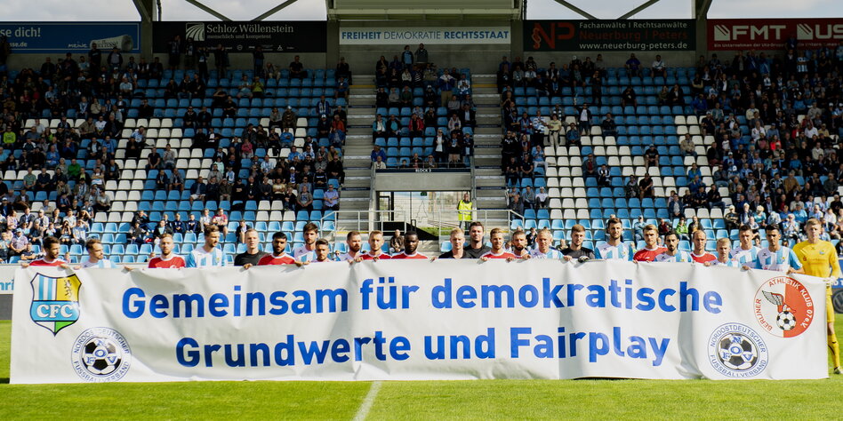 dem Transparent „Gemeinsam für demokratische Grundwerte und Fairplay“