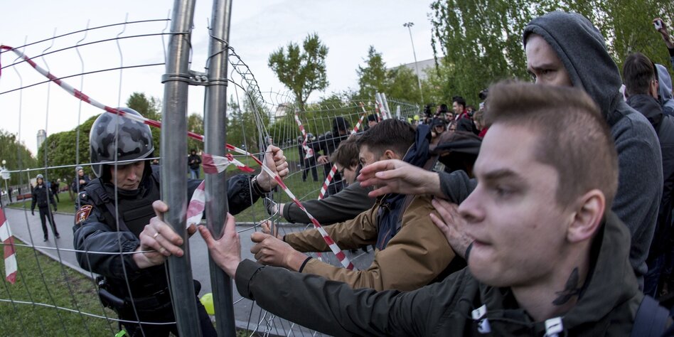 (IMG) Bild: Protestanten versuchen im Mai 2019 im russischen Jekaterinburg einen Zaun niederzurennen