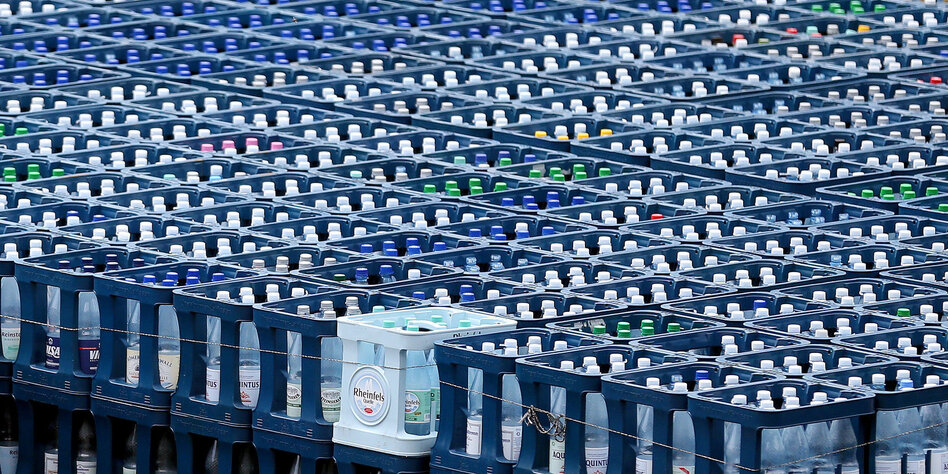 (IMG) Bild: Leere Getränkekisten mit PET-Mehrwegflaschen bei Rheinfelsquellen in Duisburg